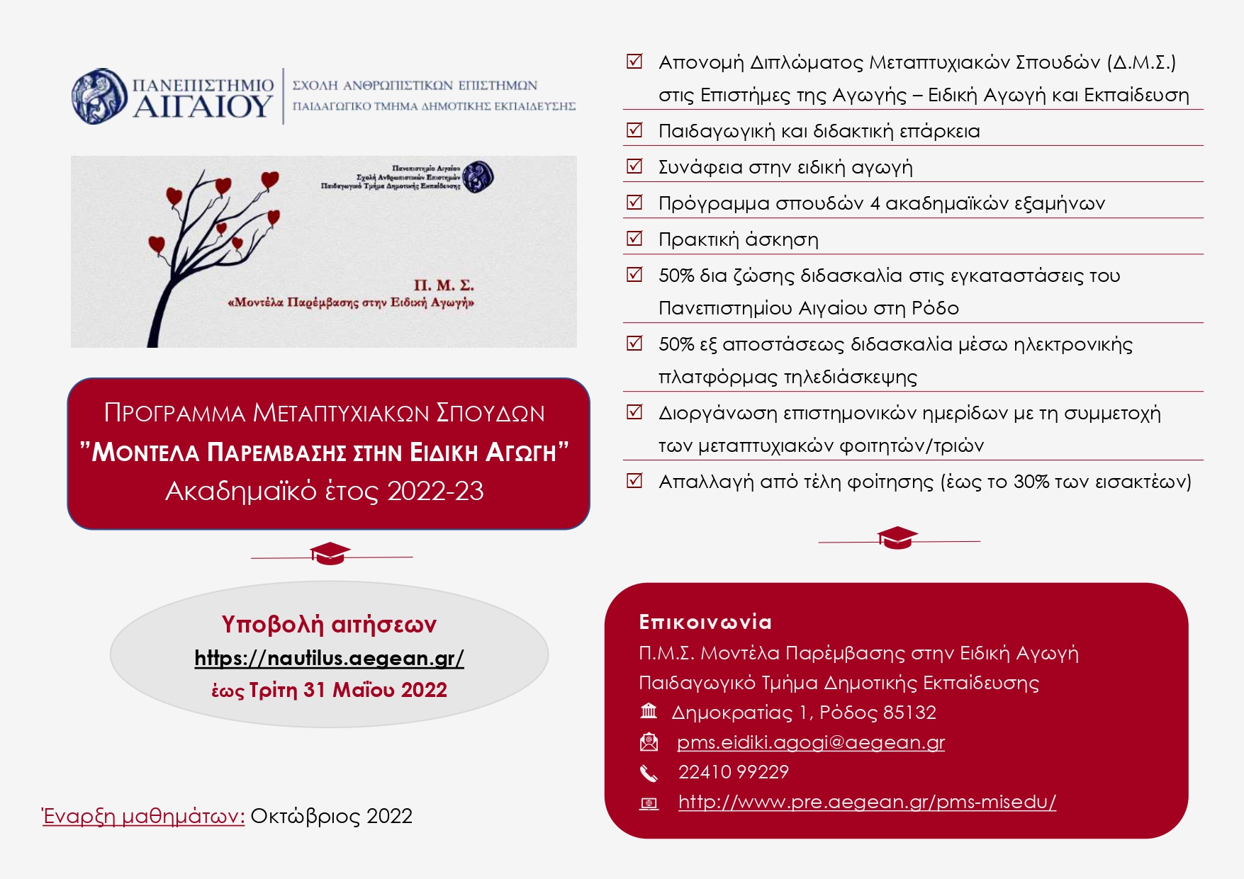 στη Γραμματεία του Π.Μ.Σ. «Μοντέλα Παρέμβασης στην Ειδική Αγωγή» στο e-mail: pms.eidiki.agogi@aegean.gr